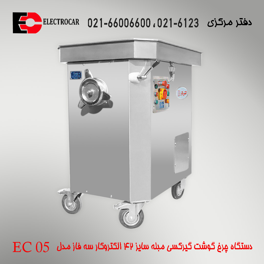 این مدل بواسطه بهره گرفتن از چرخ دنده و گیربکس جهت انتقال نیرو و البته با داشتن موتوری با قدرت 10 اسب بخار، براحتی می تواند در عرض یک ساعت حدود 1000 کیلوگرم (1 تن) گوشت تازه را بدون له کردن چرخ کند. انرژی مورد نیاز موتور از طریق برق سه فاز شهری تامین می گردد. برای سهولت در تمیز کردن و اساسا جهت افزایش اصول بهداشتی و عرضه گوشت سالم، بدون تغییر در رنگ، طعم و بو، چرخ گوشت الکتروکار 42 مدل EC05 از بدنه، سینی، تیغه و پنجره استیل برخوردار است که براحتی جدا میشوند و قابل شستشو هستند. در ساخت گلویی و روده و طوقه از استیل با کیفیت شده استفاده گردیده که در صورت درخواست مصرف کنندگان، این قطعات نیز میتوانند از استیل باشند که بر قیمت چرخ گوشت اضافه میشود. با تعبیه کلید چرخش معکوس در چرخ گوشت صنعتی الکتروکار مدل EC05 هنگام گرفتگی گلویی و مارپیچ توسط تکههای بزرگ گوشت یا رگها و چربی، به راحتی می توان مسیر را تخلیه کرد. در ضمن، حرکت معکوس مارپیچ فرآیند چرخ کردن را سریعتر و آسانتر میکند و طول عمر و دوام دستگاه را افزایش میدهد. علاوه بر موارد فوق، این مدل به صورت رومیزی طراحی شده است و به واسطه استفاده از استیل در بدنه، ظاهری براق دارد و در برابر خط و خش و انواع آلودگیها مقاوم است. در ضمن، آلیاژ استیل سبب کاهش وزن دستگاه نیز میگردد.