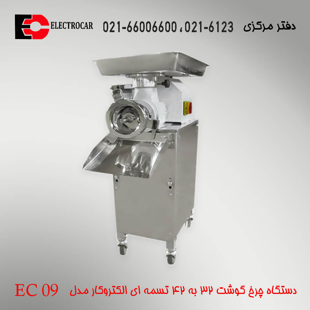 این محصول ایرانی همانند سایر چرخ گوشت های ساخت شرکت الکتروکار با استفاده از بهترین و مرغوبترین مواد اولیه تولید گردیده و در دسته مدلهای ترکیبی این برند قرار می گیرد که با توجه به دارا بودن اندازه ورودی 32 و خروجی 42 اینگونه نام گرفته و چنین طراحی سرعت دستگاه را افزایش داده است. موتور قدرتمند دستگاه چرخ گوشت تسمه ای الکتروکار مدل EC09 از توان ۳ اسب بخار بهره می برد و بازدهی 350 کیلوگرم در ساعت را به همراه دارد. یکی از مشخصه های بارز این چرخ گوشت  قابل استفاده بودن با هر نوع برق مصرفی در انواع تک فاز و 3 فاز میباشد تا هم در محیط های فروشگاهی و هم صنعتی کاربرد داشته باشد.برخی قطعات داخلی چرخ گوشت 32 به 42 تسمه ای الکتروکار مدل EC 09مشتمل بر گلویی و مارپیچ از جنس چدن آبکاری شده و برخی دیگر شامل تیغه و پنجره از استیل تولید گردیده اند که تسهیل در امر شستشو را به دنبال دارد.